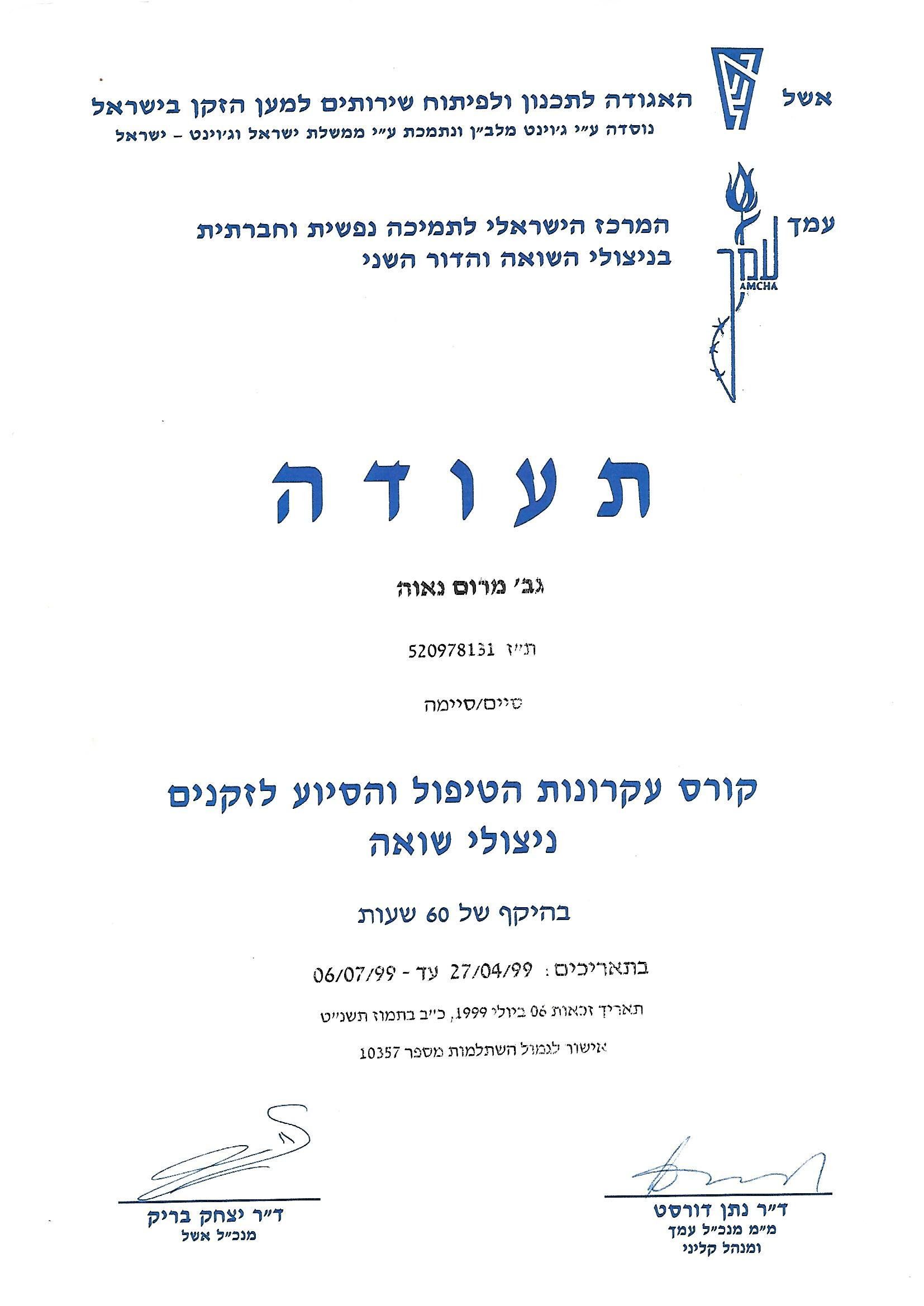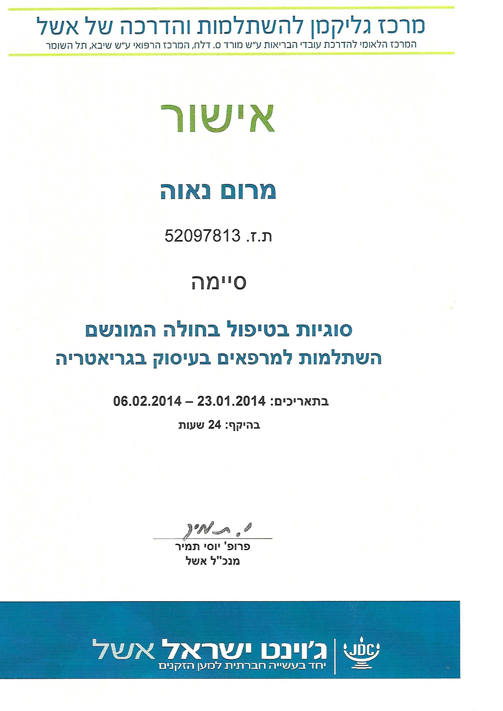עבדתי במקצועי כמרפאה בעיסוק בתחומי בריאות הנפש ואח"כ בשיקום מבוגרים נוירולוגי אורטופדי ונשימתי. ובמסגרת עבודתי עשיתי השתלמויות מקצועיות רבות. וביניהם: קורס מורחב על אנשים עם בעיות נשימה קשות ומונשמים, קורסים בקוגניציה וזכרון ועוד.