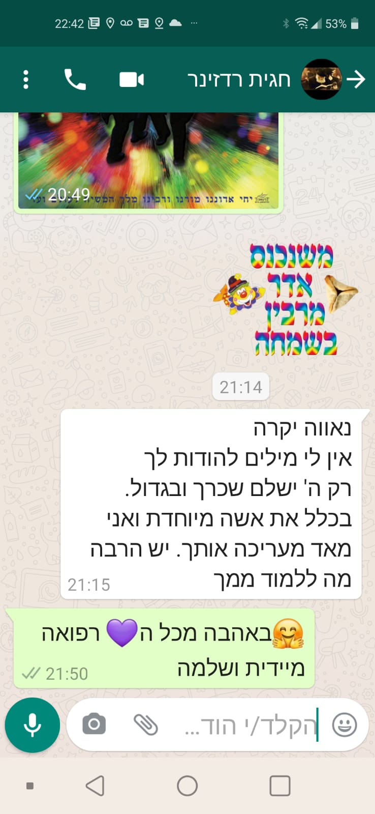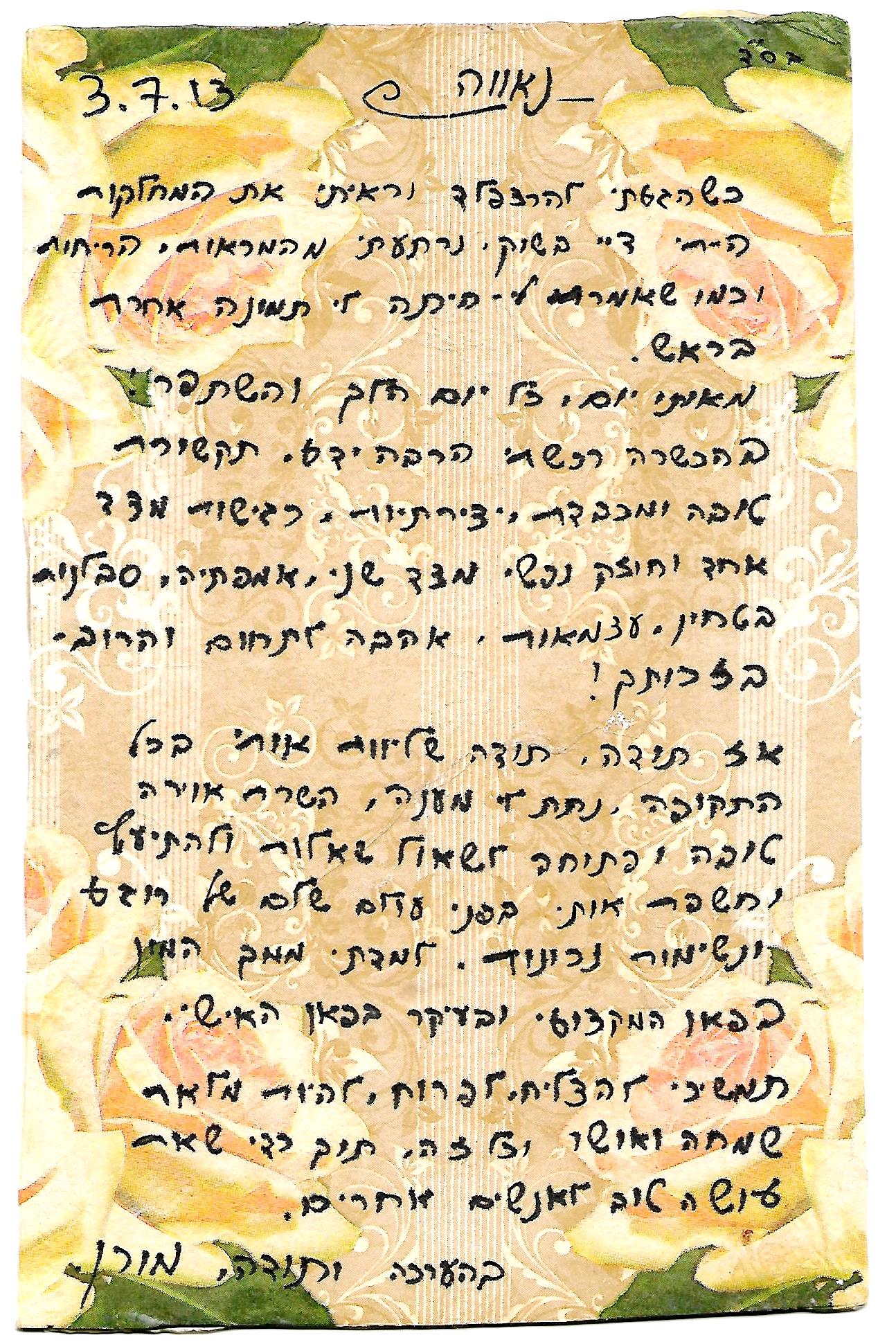למדתי ריפוי בעיסוק בירושלים, ובו בזמן ליבי, נשמתי משכה אותי למצוא משמעות ברוחניות לסבל ולשואה , שהובילה לחזרה בתשובה. חיי זרועים בהשגחה פרטית של צרופי מקרים מופלאים (מקרה= רק מה') .