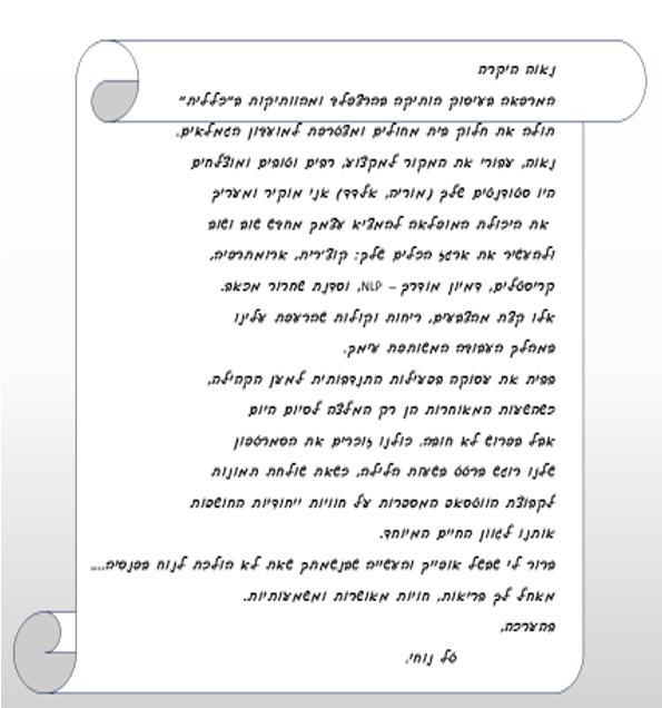 התרגול והידע הנשימתי משפיע ומחבר אותנו למי שאנחנו באמת- למהות ומביא להרגשת שלמות ויכולת התמודדות בכל הרבדים של האדם -גוף, רגש מחשבה ונשמה , ידע ששייך לאור ההולך וגובר של עידן הגאולה בפשטות ואני מודה לבורא ורואה כשליחות לתת אותו לעולם .